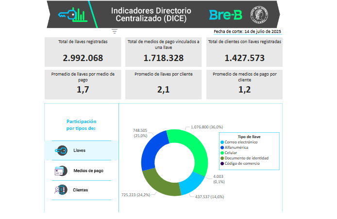 El Banco de la República informó que, al corte del 14 de julio de 2025, se han registrado 2.992.068 llaves en la plataforma Bre-B, un sistema diseñado para facilitar pagos y transferencias inmediatas entre cuentas bancarias y billeteras electrónicas en Colombia.